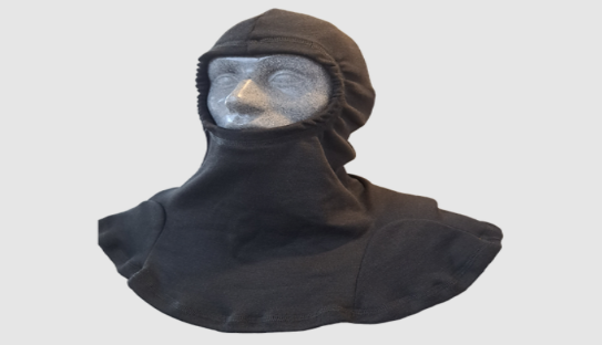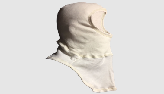 Capucha de cara completa de doble capa, de 18” de longitud, en Nomex de tejido de punto en color blanco natural, de poco peso y ajuste cómodo. Diseñada para proteger el cabello, orejas y parte posterior de la cabeza contra el calor y las llamas suscitadas durante un incendio, sin costura en el área de la barba para mayor protección. La capucha de cara completa se puede utilizar con su equipo de Respiración Autónoma (SCBA). Cosida con hilo 100% Nomex.